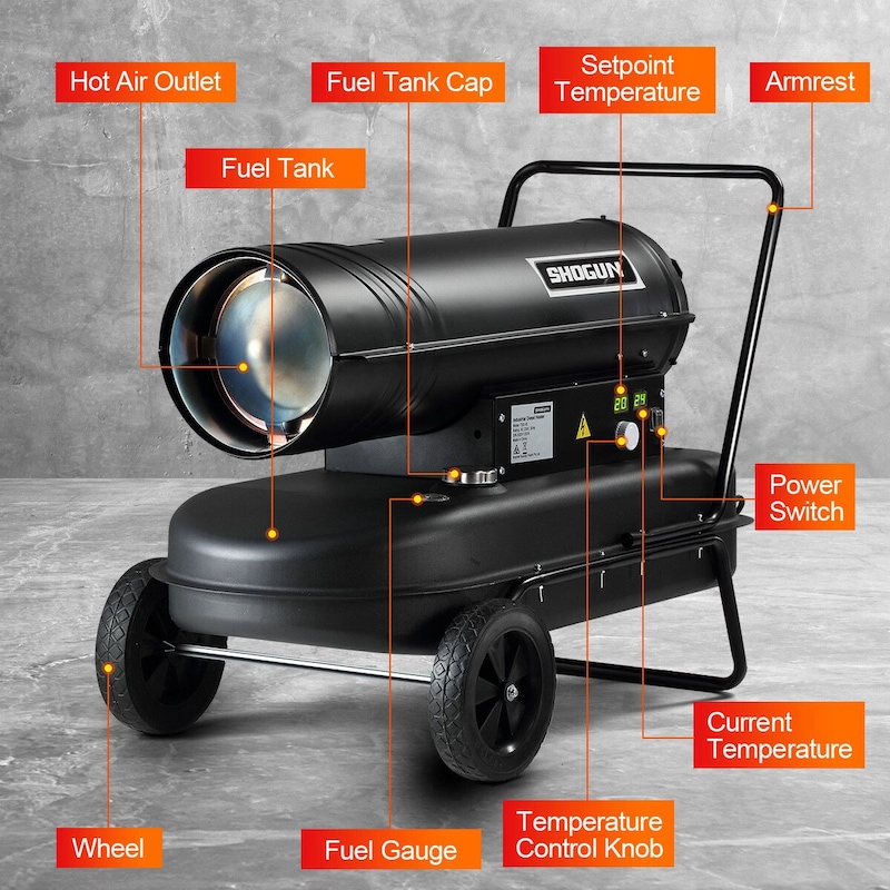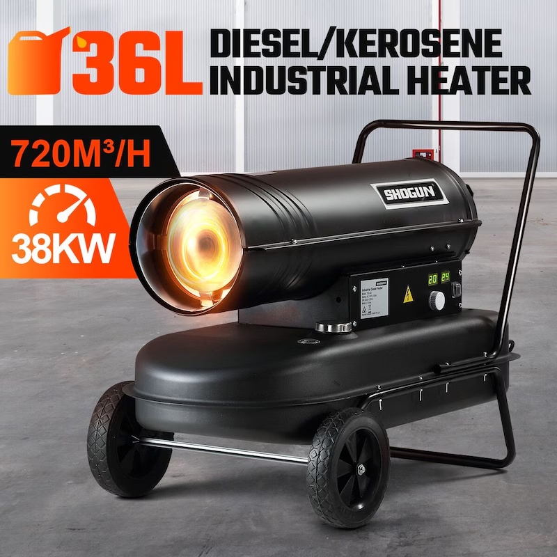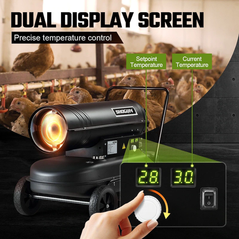 This 40kW industrial fan heater is perfect for those who are running a workshop, chicken farm or wood processing plant. The powerful diesel heater is highly efficient and at the same time, is energy-saving, as it features a 40kW max heat output, a large air duct, more air outlets, and dual digit displays, as well as intelligent constant temperature control and high-temperature protection which can activate the auto power-off function. The kerosene heaters can quickly heat up a room of up to 290m². It is a perfect choice for factory owners or farm owners. Invest in a high-value fan heater right now!